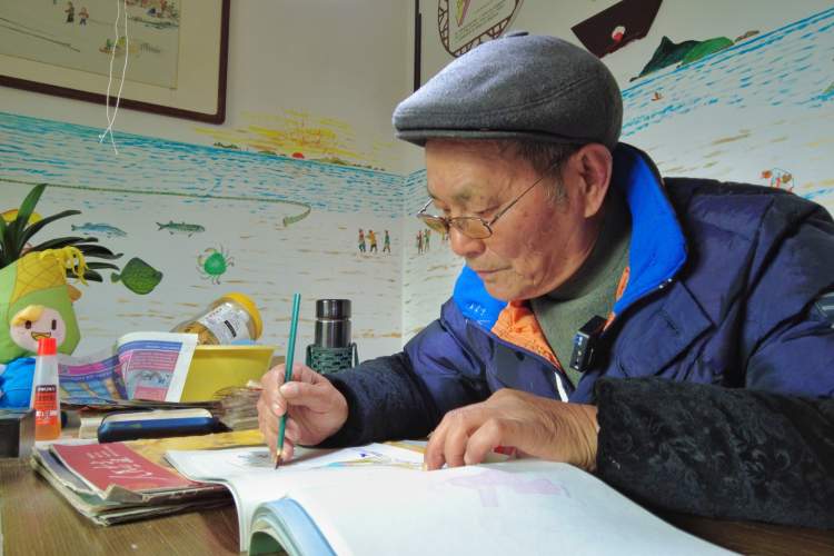 杨火根的渔民画上过国家地理杂志,但他只是个上过小学的老渔民。如果要说他的画技师从了谁?那么他的老师就只能是大海。上完小学他就上了渔船。为了生计,青年壮年时代的杨火根基本上没有时间画画。