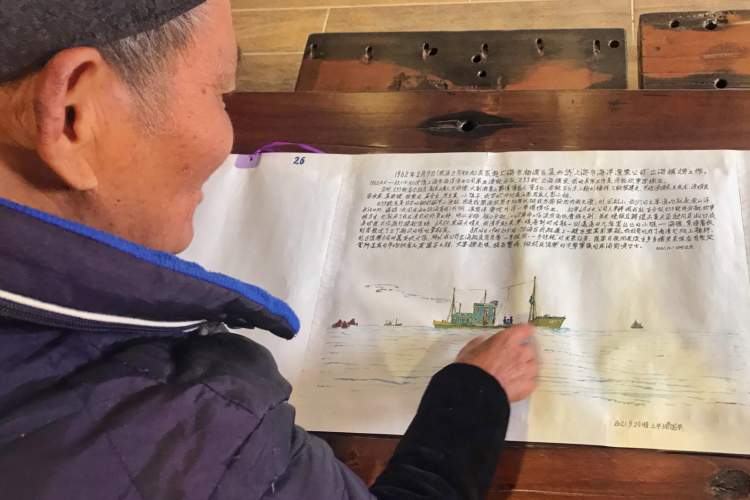 杨火根一边展示,一边讲解。他第一次下海撒网落水的糗事,在茫茫大海上如何确定渔场位置、如何向水下几十米深的海底插竿子、如何判断海底是泥沙还是岩石、如何看云识天气等等。