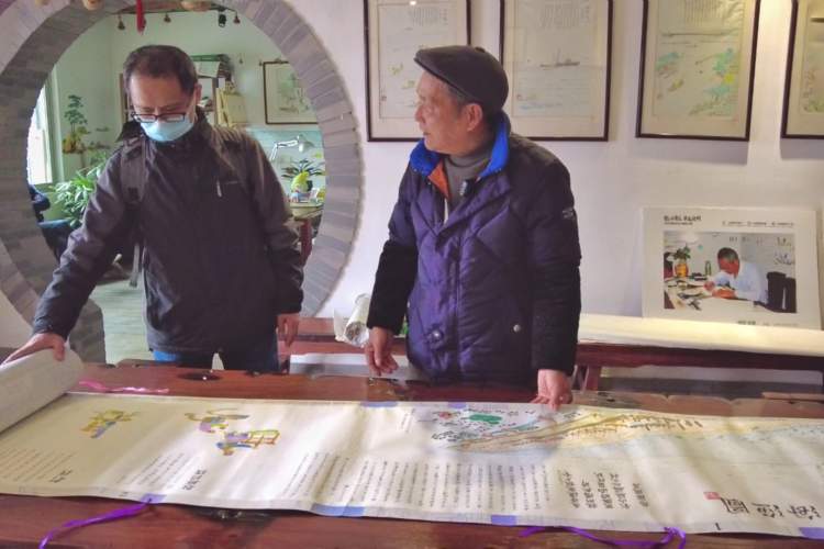 杨火根的渔民画工作室的“镇室之宝”当属他的30多米的渔民画长卷。78岁的杨火根精神矍铄,身体硬朗。在他工作室长长的展示台上,他亲手解开画卷的带子,金山嘴渔村的记忆,就在他的眼前徐徐展开。先前在巷子里看见的以及在他家墙上看见的图画,也都一一记载在这幅画卷中。