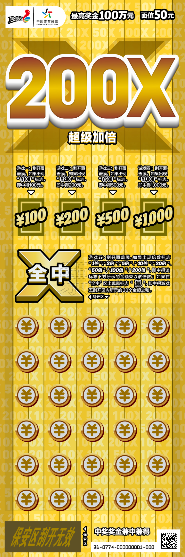 面值20元的“超级加倍”在倍数标志方面增加了“50倍”、“100倍”,“全中”区出现赢标志“赢”,可中得刮开区内20个金额之和。