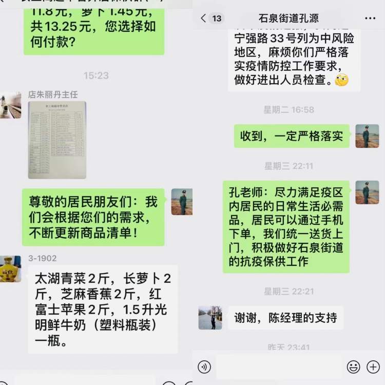 日前,宝山泗东二紡小区进行全封闭隔离管控,小区需紧急采购折叠床、睡袋、冬被等生活用品。农工商超市同泰店得知消息后,主动对接吴淞街道防疫指挥部,担下保供重任。为了让身处隔离期的市民,能满足基本生活需求,各农工农商超市充分利用起门店微信社区群,在群内发布商品信息,集结“定制化”物资,为居民定向配送。经过多方紧密联动,当晚,该小区所需的100张折叠床、 50条睡袋,20条冬被、100个拖线板、还有方便面,火腿肠、饮用水等物资全部送到了小区居民的手中。