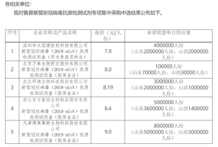 3月16日,山东省公共资源交易中心公布鲁晋联盟新冠病毒抗原检测试剂专项集中采购中选结果,11家企业申报参加,也就是说已经获批公司全部参与,最终深圳华大因源、北京万泰生物、武汉明德生物、浙江东方基因、天津博奥赛斯五家企业中选,此前在多省降价的广州万孚生物并未中标。