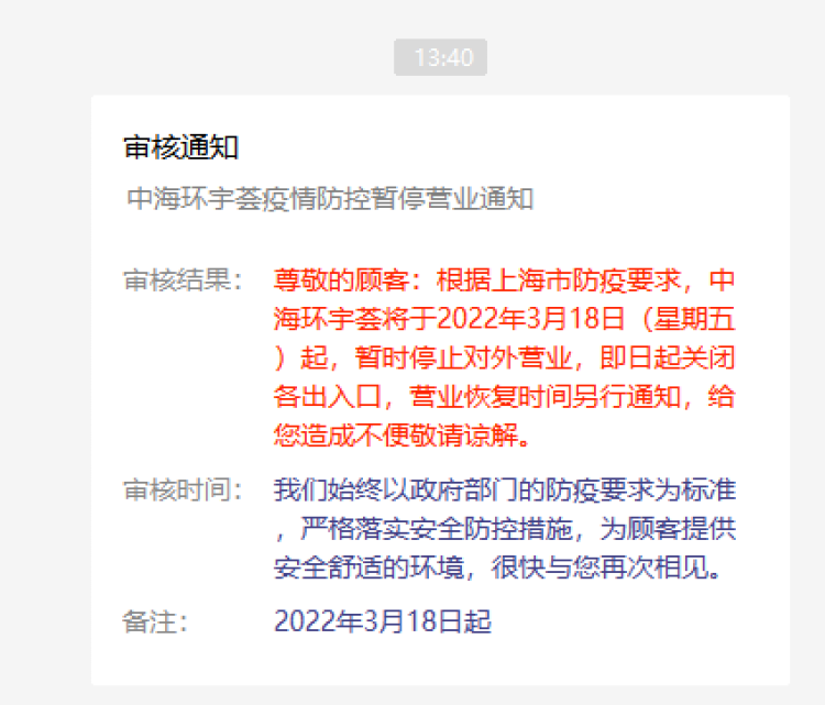 中海环宇荟下午发布了暂停营业的通知,即日起将关闭各出入口,恢复时间将另行通知。
