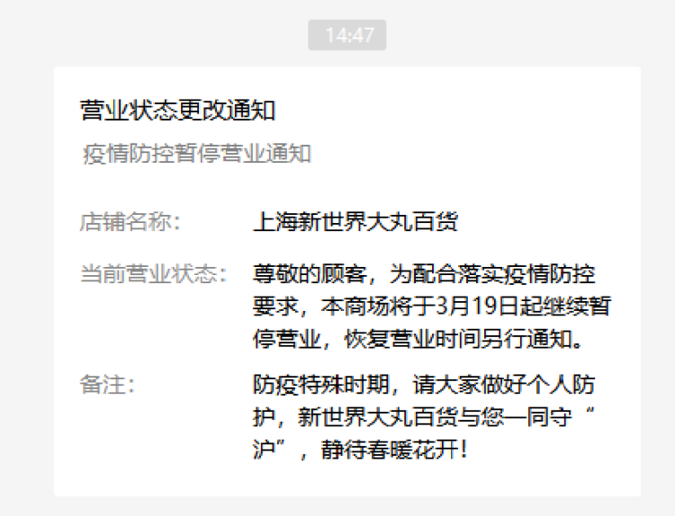 新世界大丸百货也通过短信的方式向会员发布了自3月19日起继续暂停营业的通知,而就在本周三,商场官方微信号已发布了16日至18日的暂停营业通知。