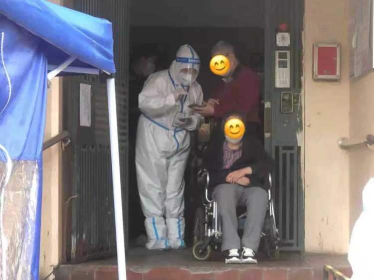 戴着面屏、N95口罩和橡胶手套,一身防护服包裹着严严实实,“大白”刘盈融拿着小喇叭对着居民楼喊着:“居民朋友们,请带好手机、身份证,下来做核酸了。”喊了三遍,她拿着喇叭一口气跑上6楼,“6楼有家居民夫妻俩耳朵不好,我上去再叫一下。”