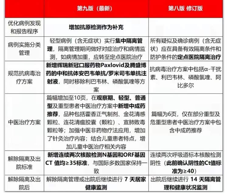 新的新冠病毒肺炎诊疗方案,在核酸检测基础上增加抗原检测作为补充,进一步提高早期发现能力;加入了两种抗病毒疗法,美国辉瑞的PF-07321332/利托那韦片联合疗法(Paxlovid)和腾盛博药(2137HK)的安巴韦单抗/罗米司韦单抗注射液联合疗法纳入;对中医治疗内容进行了修订完善。