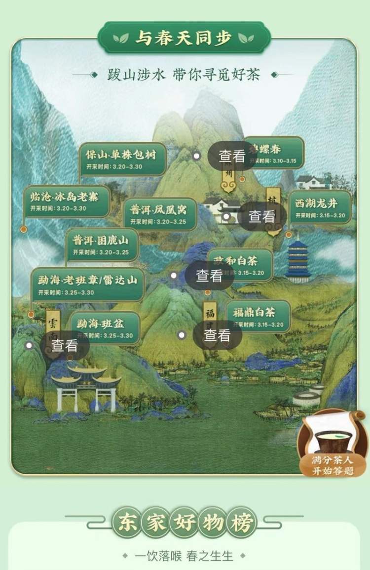 据东家创始人朱见山介绍,每年3月初东家APP发起持续近两个月的春茶季线上主题活动,“春茶地图”串起全国8个省份、11个核心产区的百大山头,包括多位非遗大师在内的上百位春茶匠人。