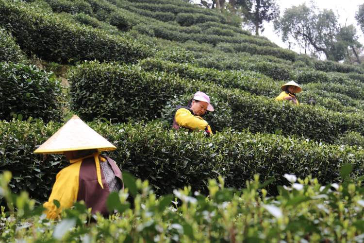 画面中,苍郁的茶树和绿意盎然的灌木林浑然一体。