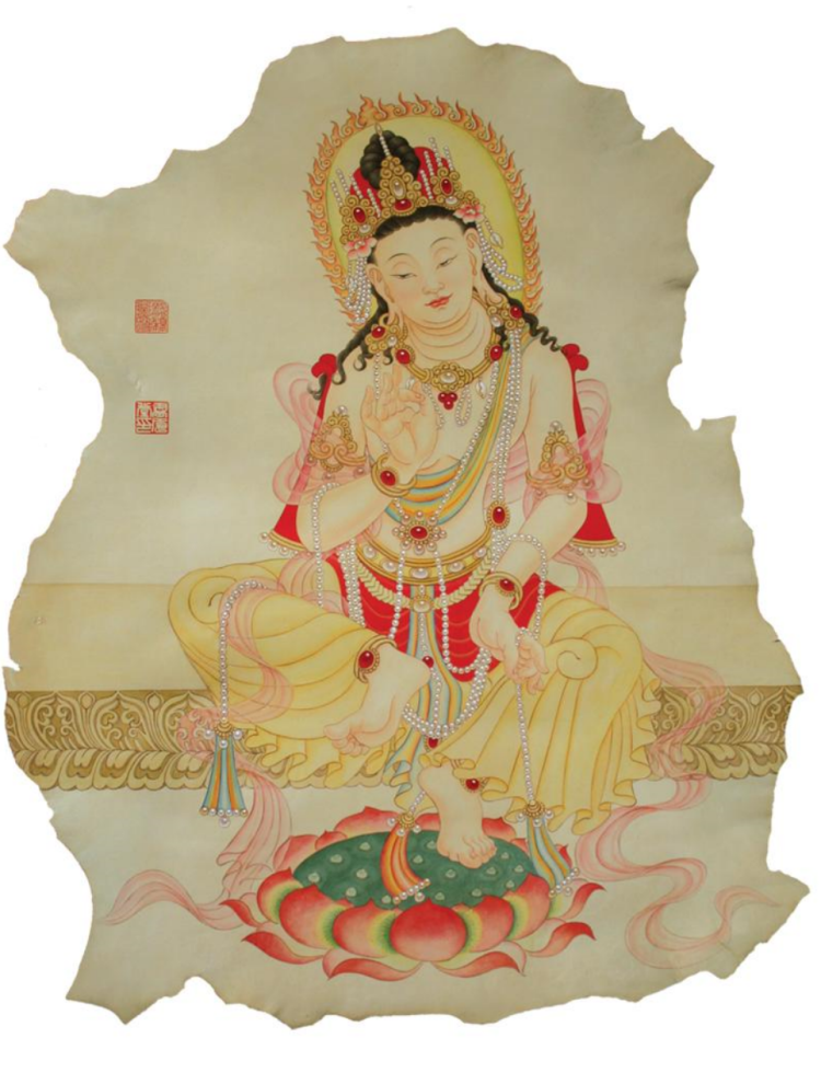 “当然,能有这么逼真的效果,也是因为羊皮画用的颜料大有讲究。我们所有的颜料都取材于珍贵天然矿物,像《观自在》中的珍珠,就用了珍珠粉。”