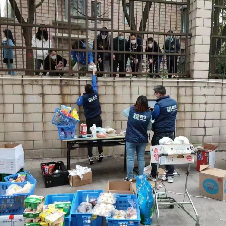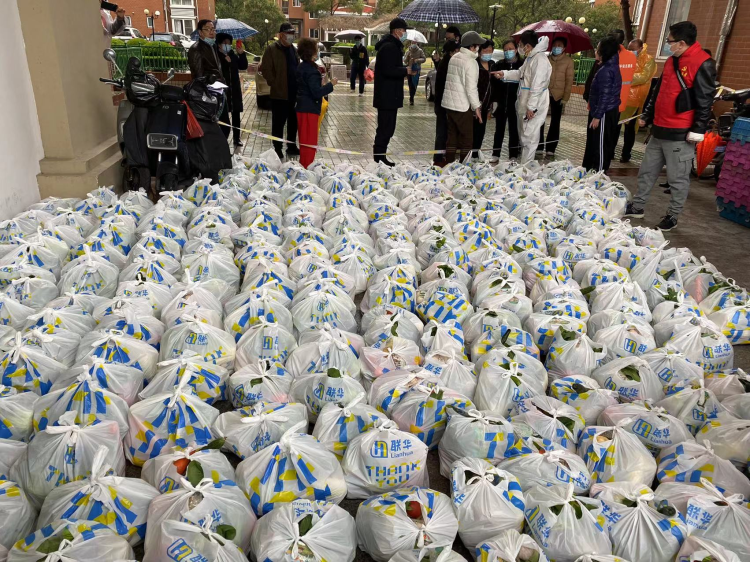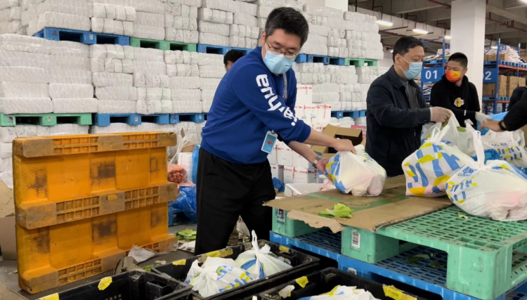 供应商紧急送到后,联华总办当晚9点在工作群内发布志愿者招募通知,最终有120名志愿者前往江桥物流中心进行支援,完成了套餐装配,再由周边数十家门店员工和增援的志愿者把安心套餐分送到各个小区,解决了市民“买菜难”的困难。