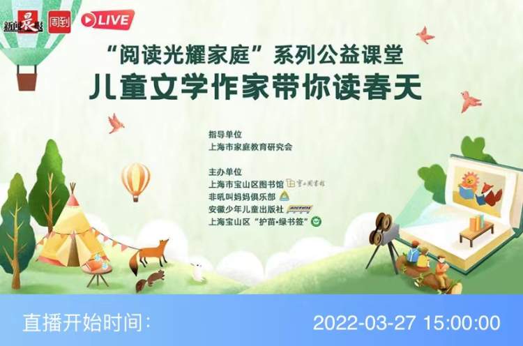 周到君从宝山区图书馆获悉,自2022年3月27日起,每周日下午“阅读光耀家庭”的公益系列课堂上线,课堂将陆续邀请全国著名儿童文学作家光临直播间。