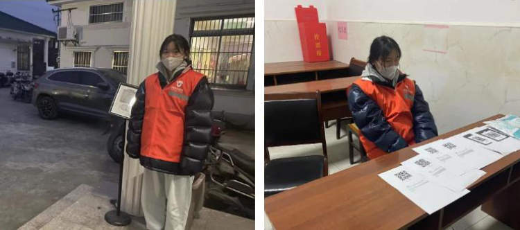 陈红同学在青浦区夏阳街道参加志愿服务,主要工作包括在村居委会卡口值守、测量进入人员的体温、协助工作人员帮助居民获得健康云核酸检测码、协助社区工作人员整理居民资料等等。