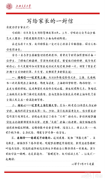 信里说:“作为家长的您将孩子放到交大,学校也接过了作为‘父母’的责任。新行政楼里通宵达旦的指挥部领导和专家,送餐‘天团’的每一位老师,宿舍楼栋的驻楼思政……他们不眠不休,全力以赴,用爱守护者每一位学生。”