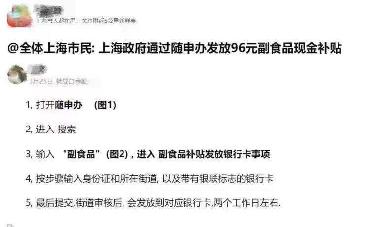 近日,一则“全体上海市民可以通过随申办领取96元的副食品现金补贴”的消息在一些微信群和朋友圈散播,声称只要在随申办APP搜索栏搜索关键词“副食品”,然后根据跳出的页面逐项填写个人信息,经街道审核,两个工作日就能到账。3月27日,记者从随身办了解到,该项政策并非市民的疫情补贴,也不适合全体市民。