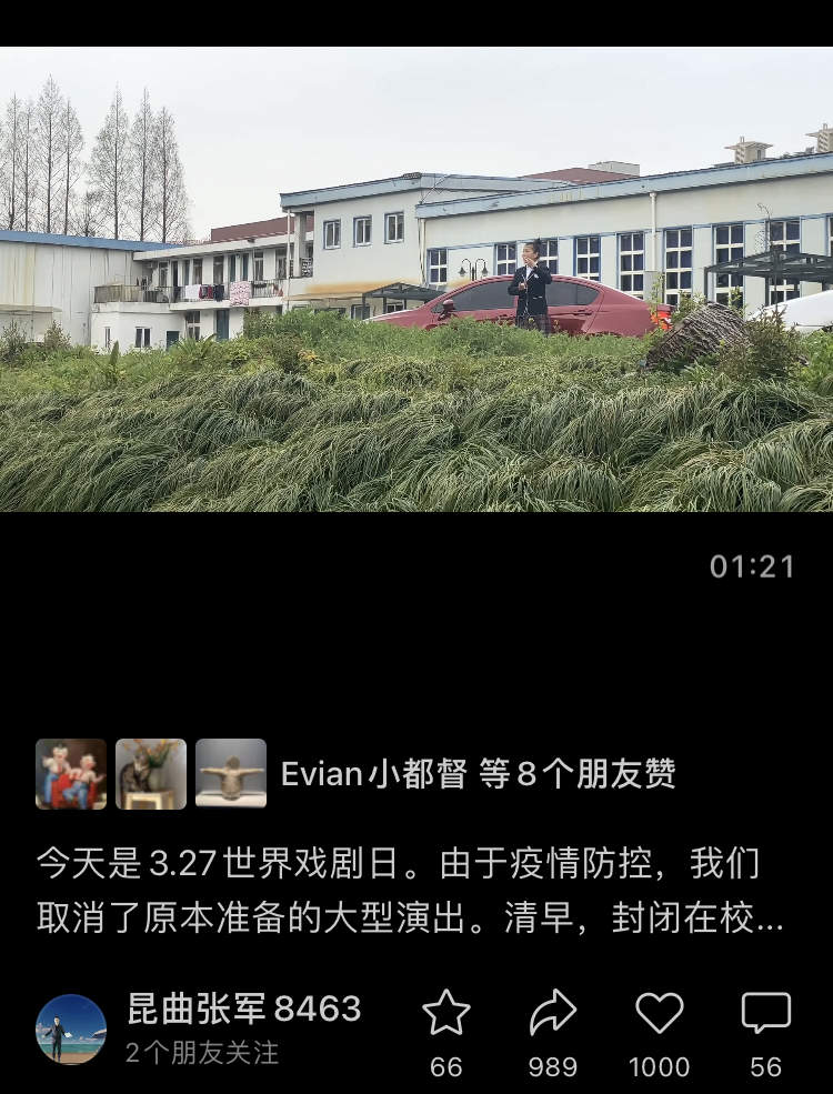 今天是3.27世界戏剧日。由于疫情防控,我们取消了原本准备的大型演出。清早,封闭在校园里的上海戏校的孩子们为对岸同样封闭在小区里的居民们表演,同样滋滋有味。对啊,人生何处不是舞台?戏剧就是生活!