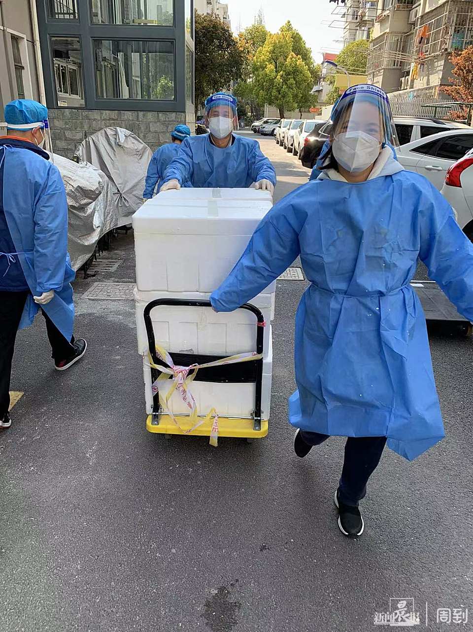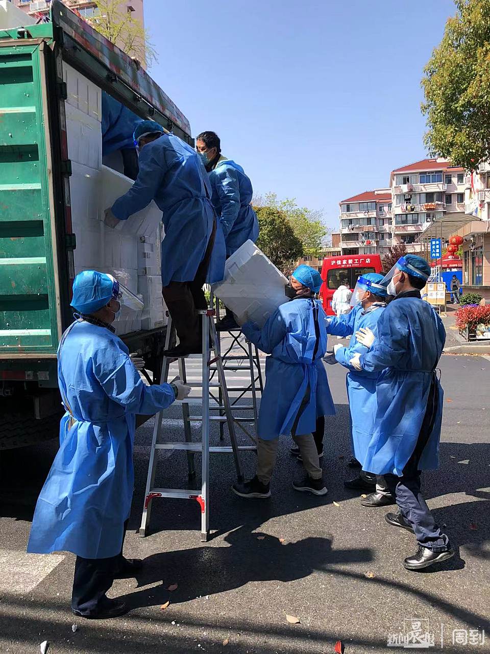 下午1:24分一辆满载着爱心蔬菜的货车抵达临汾路375弄,40名青年志愿者闻讯即刻赶到,来到居委会穿戴好防护装备和明确分工后,急忙赶到小区门口,协助居委干部一起卸货、分装,以接力的形式,将每箱30斤左右的援助物资装上小推车,依次送到居民的家门口。