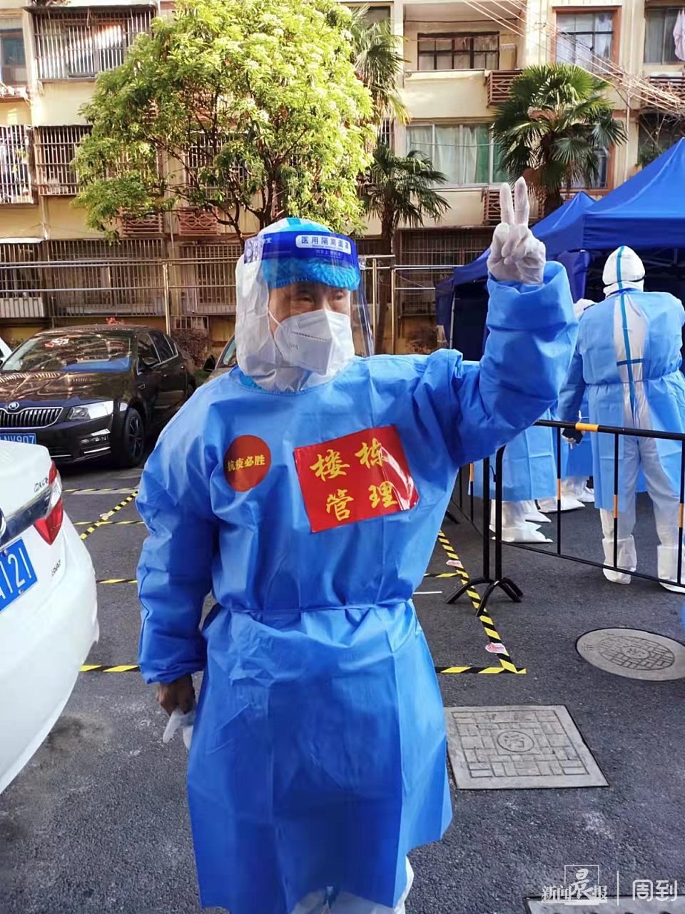 整个过程忙前忙后,我和其他志愿者一起,一层楼一层楼、一家一家敲门去招呼居民有序下楼进行核酸筛查检测,并扶送高龄腿脚不便的独居老人、提醒没有手机的老人带着身份证到检测点进行优先采样检测。虽然头部塑料面罩凝结着滴滴汗珠,但内心十分快乐,很有成就感。抗疫同心,人人有责。