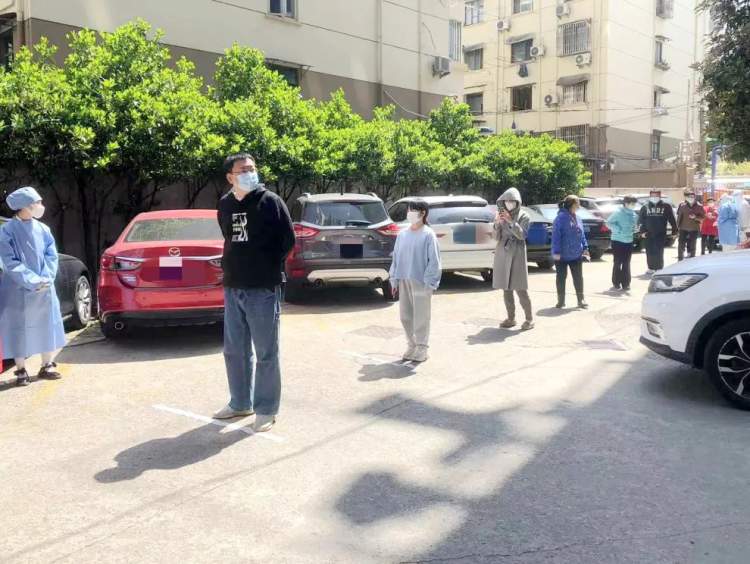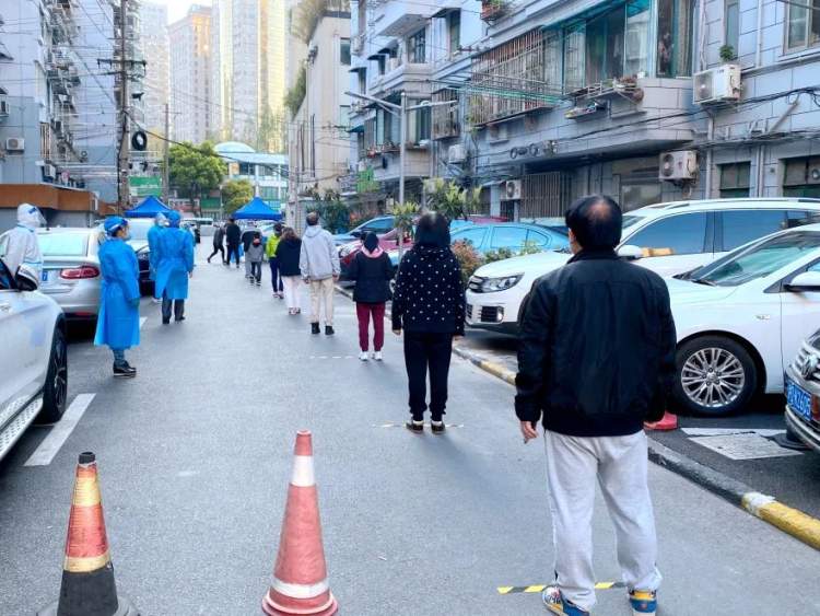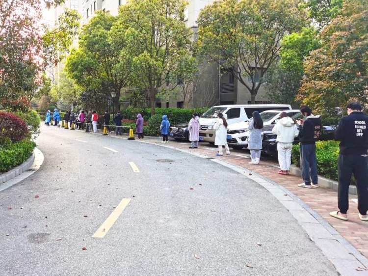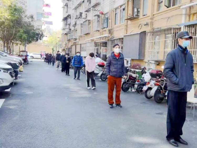 在核酸检测现场,居民们保持2米间距,有序排队,等候检测。
