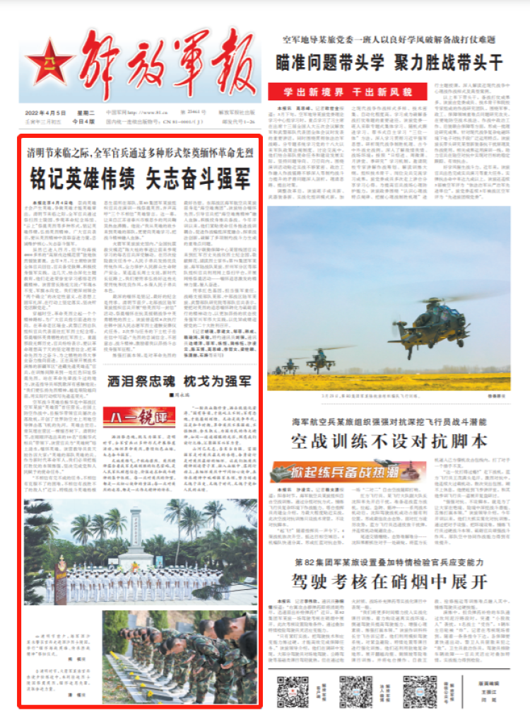 西宁联勤保障中心某管线团官兵来到红军百丈关战役烈士纪念园,敬献鲜花、诵读烈士家书;第71集团军某旅、海军陆战队某旅、忻州军分区等部队组织官兵利用网上祭扫平台,开展网络祭奠活动……缅怀追思激发的精神力量,催人奋进。