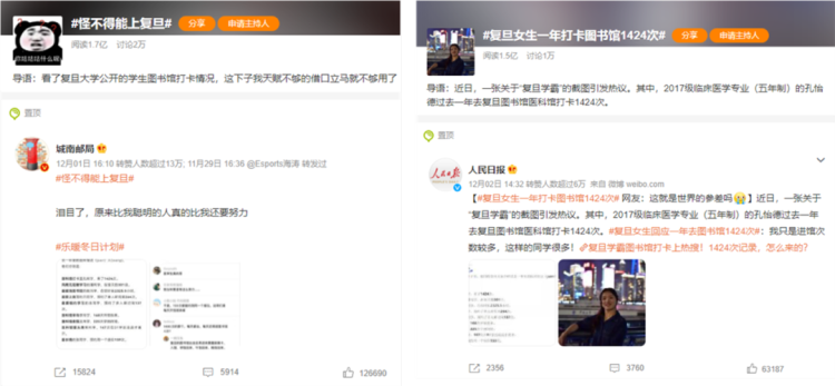 在热搜话题的评论区,不少人称她为“卷王”,但孔怡德认为,去图书馆对复旦人来说是很平常的事情:“复旦有着浓郁的学习氛围,学生专注课业,人均学习时间长。打卡多并没有特别之处,我只是进馆次数较多,校园里这样的同学很多!”