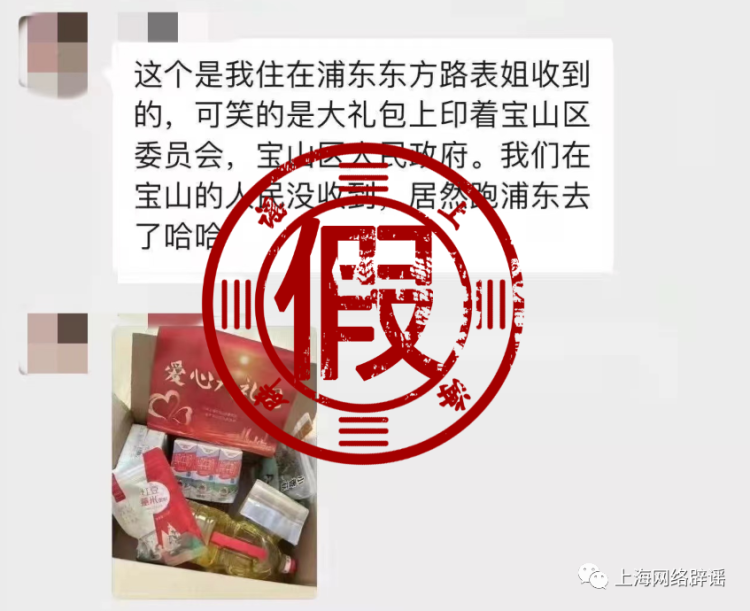 近日,网上热议一组“宝山个别街镇抗疫物资发放不均问题”的微信聊天记录。对话中一网友提到,“这个是我住在浦东东方路表姐收到的,可笑的是大礼包上印着宝山区委员会,宝山区人民政府。我们在宝山的人民没收到,居然跑浦东去了”,并配发了一张大礼包图片,该图片上却有宝山区字样。不少粉丝留言希望上海辟谣平台求证。