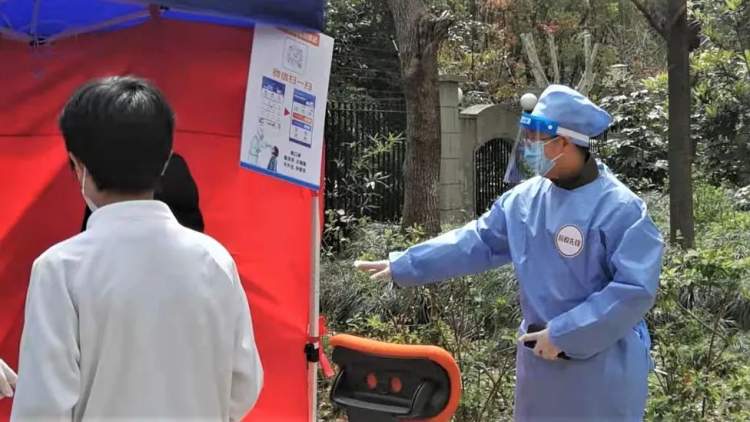 4月1日小区进行第一次核酸检测,钟胜华成了核酸检测志愿者团队一员。早晨6点半,他和小区其他志愿者在居委会集合,穿上防护服,明确工作岗位,弄清注意事项就开始行动了。