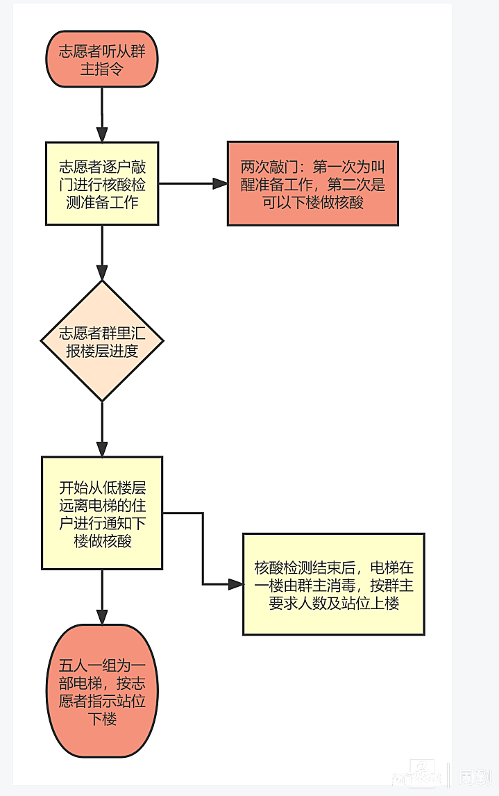 4月4日早上5点半,他先去给每个志愿者送去了防护服,等志愿者们穿戴好后,他在一楼大厅给大家做了个宣导,将第一次组织核酸过程中出现的注意事项再跟大家重申一遍,告诉大家他会陪着每个志愿者去每个楼层清点人数,届时再有问题直接和他沟通,不用再在群里讨论了。