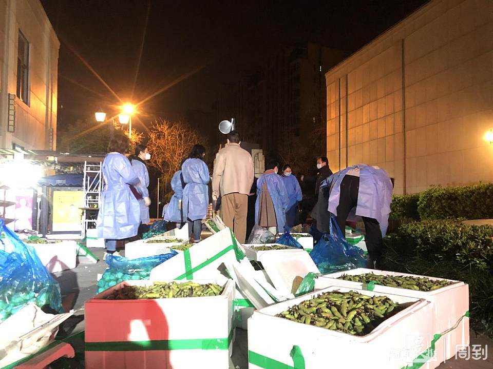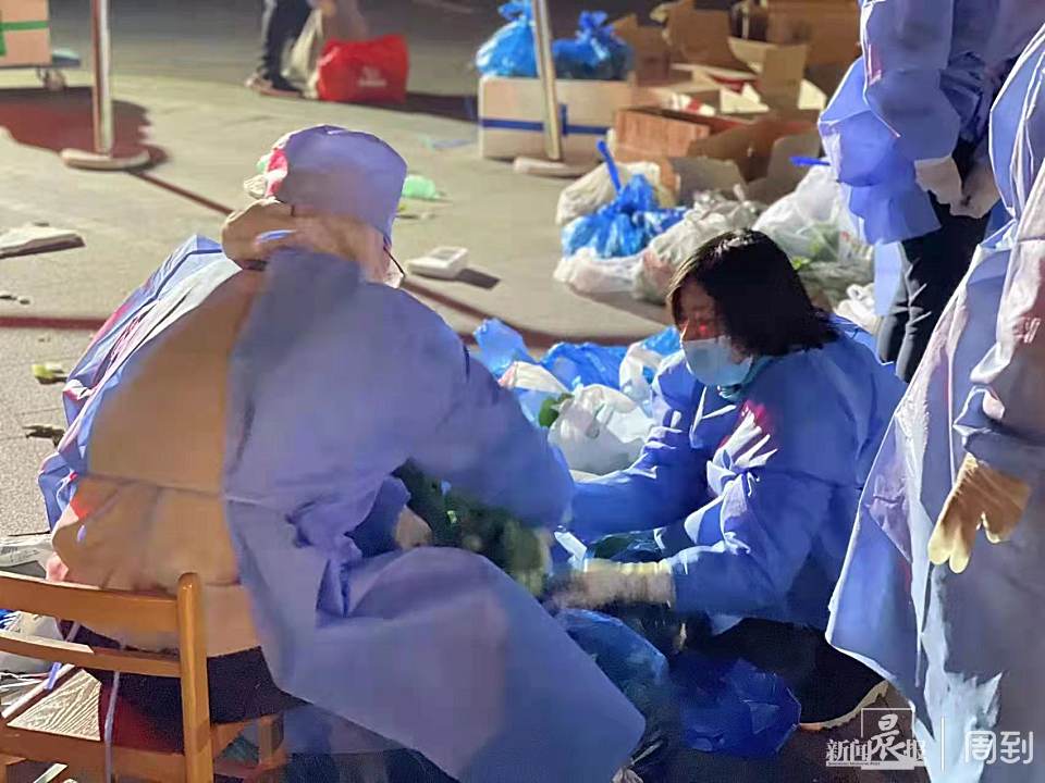 前一天半夜12点半送达小区后,在二十多名志愿者和十多名物业工作人员的共同努力下,4000斤的新鲜的蔬菜被连夜分拣完毕,并于凌晨3点,被送至了各个居民家的门口。