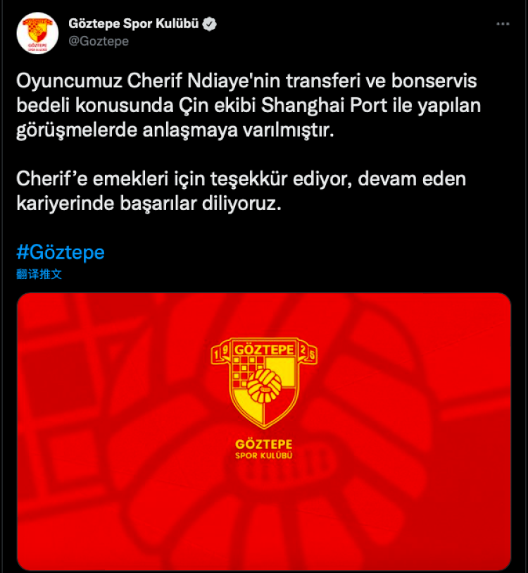 土耳其超级联赛俱乐部哥兹塔比官方发布了恩迪亚耶转会上海海港俱乐部的新闻。