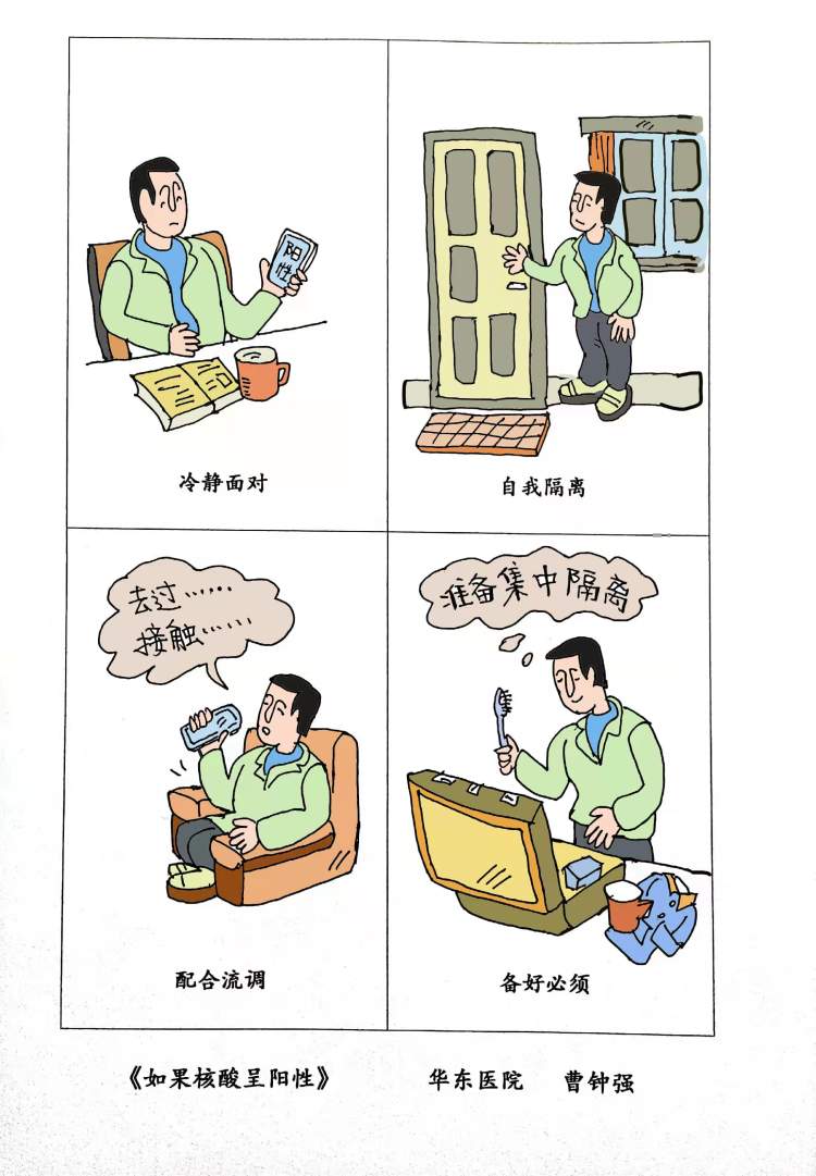 作品说明:大家面对核酸报告呈阳性,不要紧张,要冷静面对,配合流调。在自我隔离期间,备好生活必需品,一旦防控需要集中隔离和诊治,做好充分准备。