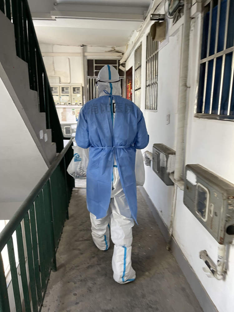 彭浦镇社区卫生服务中心一位医护人员说,“跟她搭档的消防医院医生体能特别好,很快就爬上六楼了!”该中心一位工作人员还专门拍了一小段视频,“希望把最辛苦的这一拨人(记录下来),让大家知道,他们具体在做什么工作”。