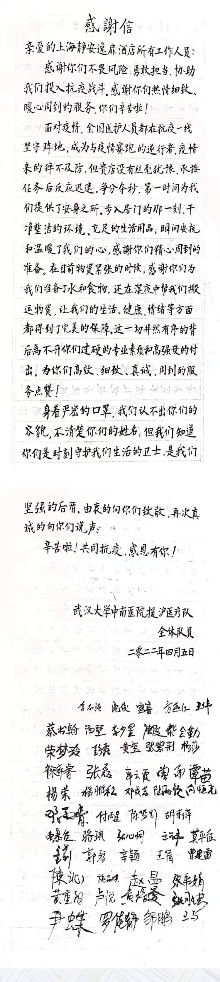 “感谢你们不畏风险、勇敢担当,协助我们投入抗疫战斗。感谢你们热情细致、暖心周到的服务。你们辛苦啦!”4月5日晚上8点,正在前台值班的酒店服务总监夏建莲,收到了在此下榻的武汉大学中南医院援沪医疗队的一封手写感谢信,末尾还有一串长长的签名,一共是51人,一个不少。