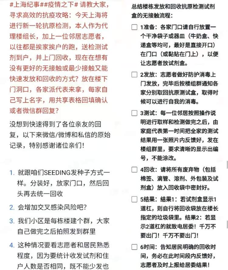 怎样在无接触的情况下统计出每户到底有多少人?怎样进行无接触的物料发放和回收?先前,我在微信、微博上提出过这个问题,广泛征求意见。又用共享文档向楼组居民征集建议,大家把各自的想法一条一条往上写。