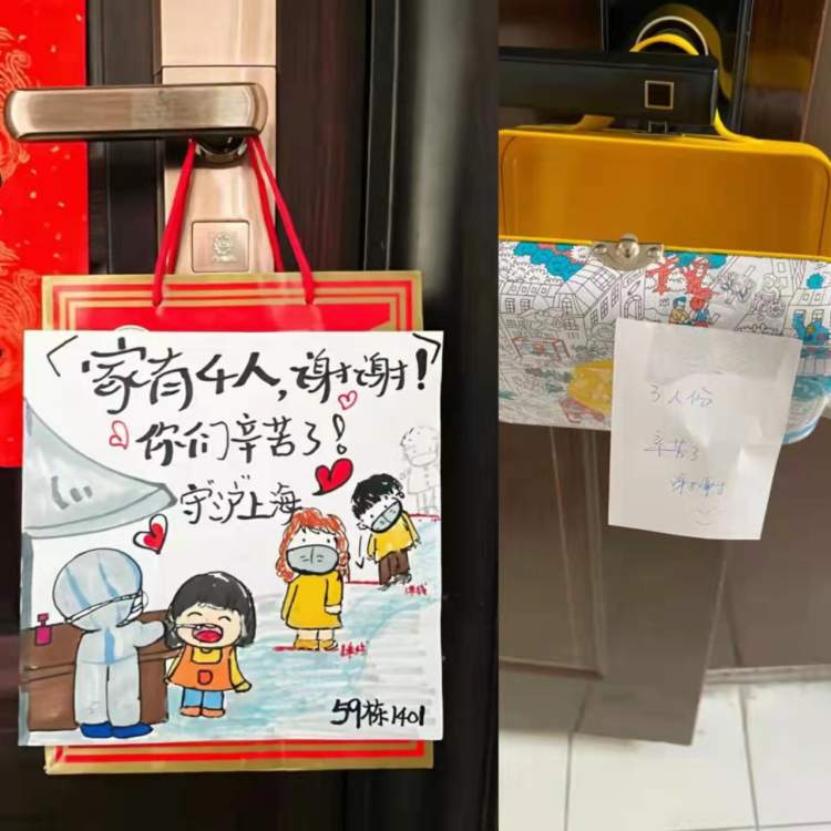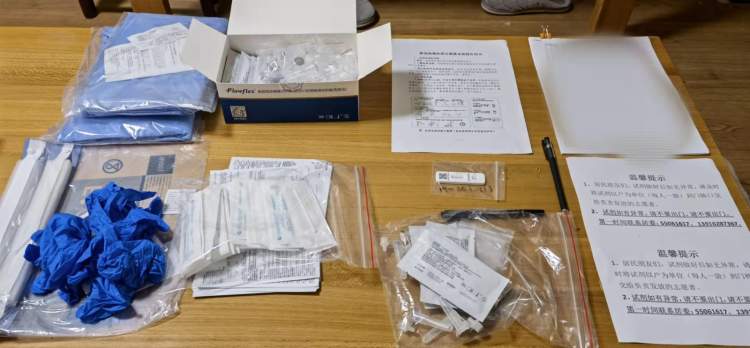 然后,我做好消毒工作,按照登记的人数,到各家门口发放抗原材料。在我上门前,居民们已经按照群里的通知,在门口放了袋子或器皿,用于接收材料。