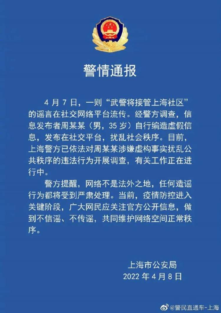 4月7日,一则“武警将接管上海社区”的谣言在社交网络平台流传。经警方调查,信息发布者周某某(男,35岁)自行编造虚假信息,发布在社交平台,扰乱社会秩序。目前,上海警方已依法对周某某涉嫌虚构事实扰乱公共秩序的违法行为开展调查,有关工作正在进行中。