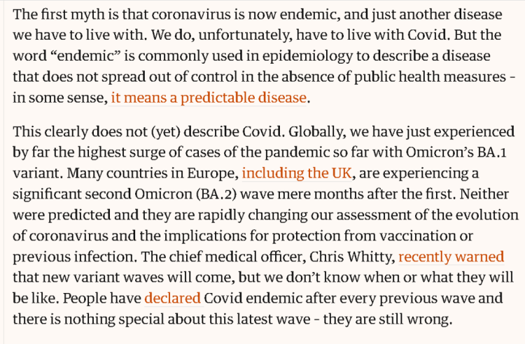 首先,人们误以为新冠肺炎疫情已经“结束”了,误以为新冠肺炎已经属于与其他和人类“共存”的常见传染病或“区域性流行病”(endemic)。但事实并非如此,因为新冠病毒的变异仍然难以预料,还在失控地传播,比如,全球正在经历奥密克戎BA.1变种毒株所引发的大面积感染,同时包括英国在内的欧洲又遭到了奥密克戎BA.2变异毒株冲击,这明显与可预测的“区域性流行病”的定义不符。