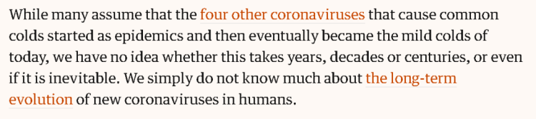另外,即便是现在人类已知的只会引发普通感冒的四种冠状病毒,从前也可能引发过大疫情,但人们并不知道它们变异到如今的地步耗费了多长时间——是数年、数十年,还是数个世纪。