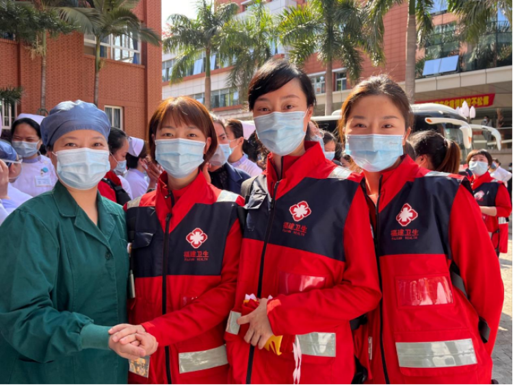 4月7日,在福建医科大学附属协和医院,郑碧云和其他援沪医务人员合影。(福建医科大学融媒体中心供图)