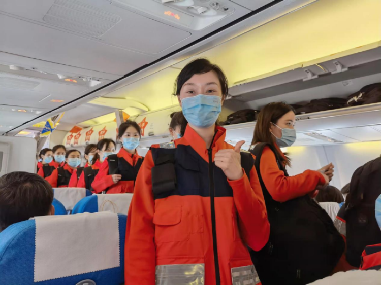 4月7日,在乘坐前往上海的飞机上,郑碧云对着镜头点赞。(福建医科大学融媒体中心供图)