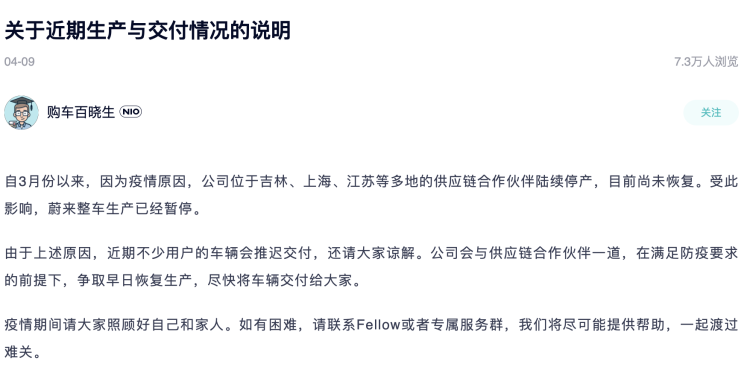 今天,蔚来汽车宣布,称自3月以来,因受疫情影响,蔚来位于吉林、上海、江苏等地供应链合作伙伴陆续停产,目前尚未恢复。受此影响,蔚来整车生产已暂停,因此近期不少用户车辆交付会推迟。