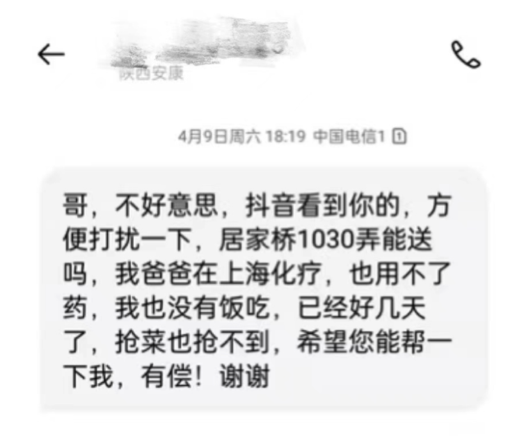 我是一名上海闪送员,今年33岁,江西抚州人,最近我因为在网上发了几个送菜的视频,被很多人关注点赞,后面就有很多人联系我找我帮忙买菜或者送一些东西。这些天找我的人很多,看到那些求助的信息心里很不好受,所以就想把这几天看到的写一写,希望有更多的人可以相互帮助,共同度过难关。