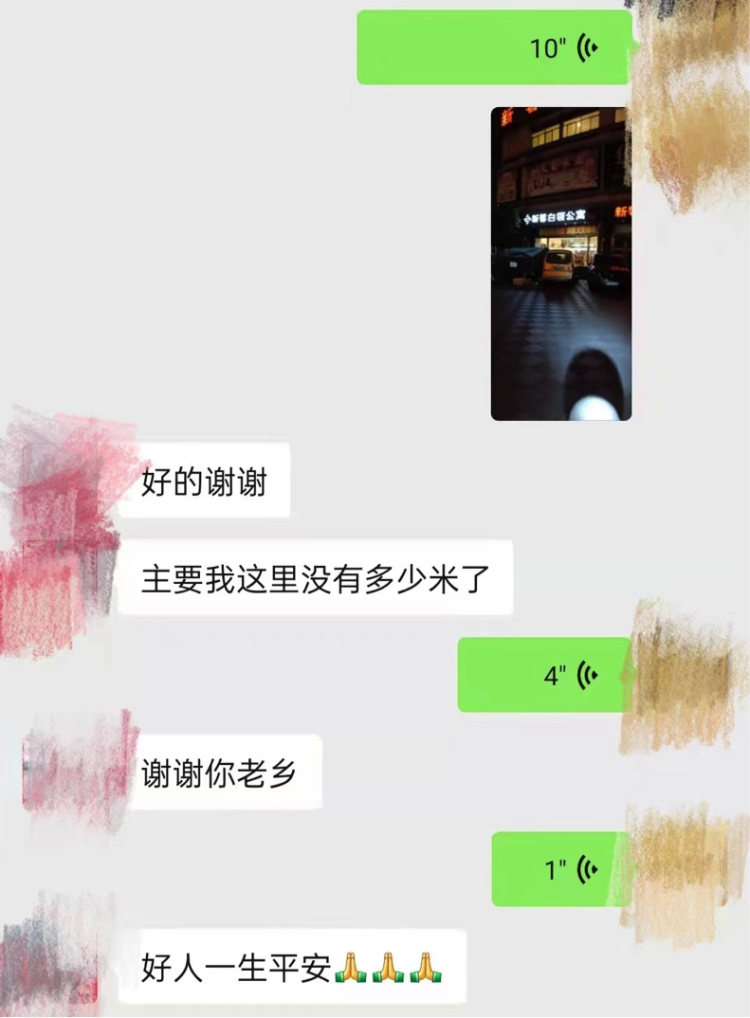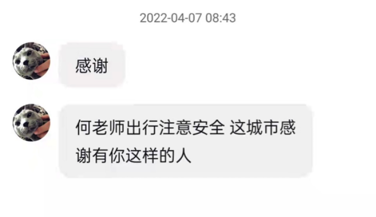 我听到这些感谢之后很开心,也很有成就感,觉得自己做这些事很值得。不过就是委屈我老婆和爸妈了,他们在家乡还是有点担心,昨天和老婆视频的时候她就说我瘦了不少,眼窝都凹进去了,幸好老婆和两个孩子都在老家,我自己瘦点没事。而且我还算好的,跟我一起跑的那个闪送员老乡胖子,本来180多斤,这两天至少减了得有10多斤了。