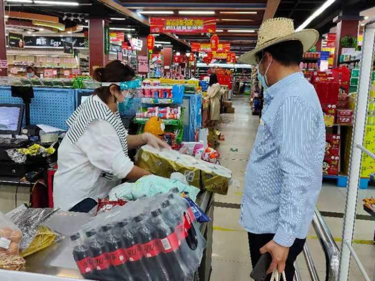 结账结束,大哥顺着出口的标识走出超市,门口已经排了一小段队伍,有人手里捏着袋子、有人推着小推车、有人正在扫码,间隔两米,安静地排着队,“有'人气'了,没刚来的路上这么安静了。”