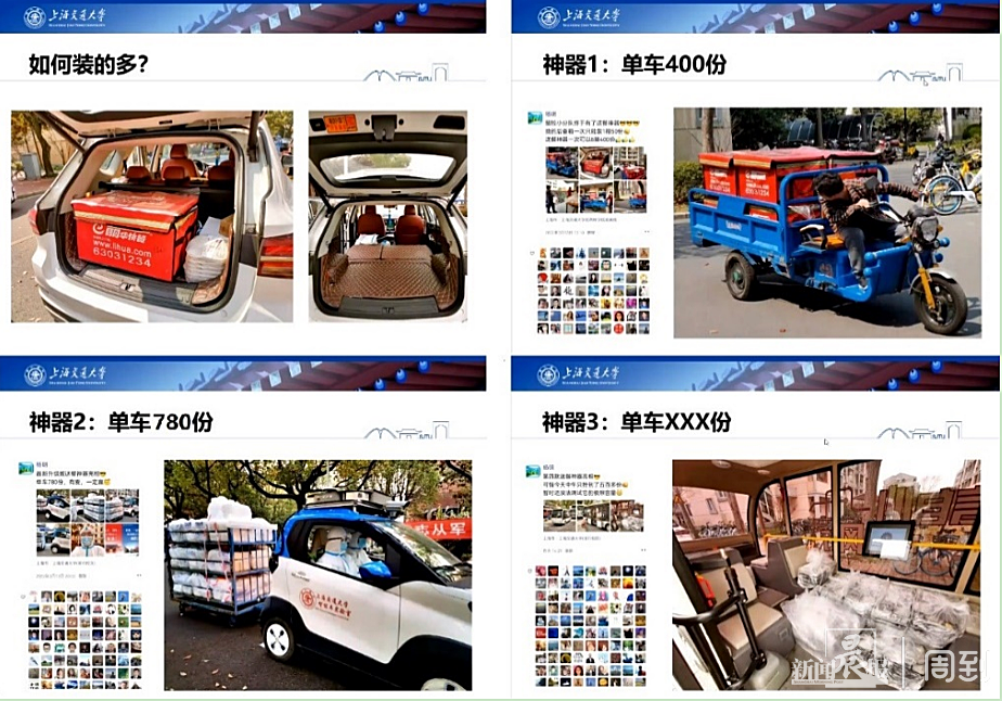 在交大闭环管理期间,教师志愿者们每天要完成全校3万名学生一日三餐的配送。从私家车到三轮车,再到无人拖车、无人小巴,交大正通过各种方式来完成这个艰巨的任务。