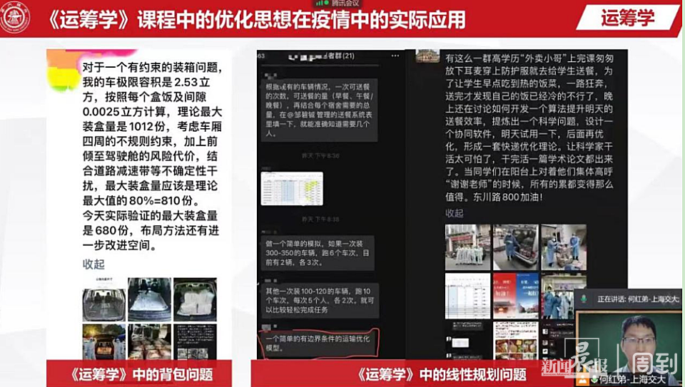 “校园3万师生每人三餐的配送可以看作《运筹学》中的线性优化问题,在校老师利用私家车进行每日三餐配送时后备箱的装载可以看作《运筹学》中的背包问题等,私家车、无人小汽车、大巴等不同的配送方式拥有不同的运输能力,这正是《运筹学》中的线性规划问题。” 何老师介绍。