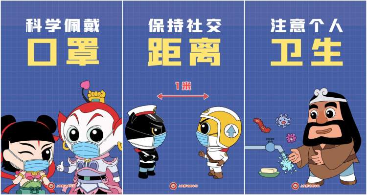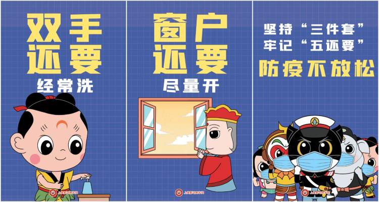 活泼直爽的哪吒、正义勇敢的黑猫警长、顽皮善良的大耳朵图图、机智可爱的蛋生等上美影动画IP还出现在宣传海报上助力防疫,以生动形象的方式宣传“三件套”“五还要”: