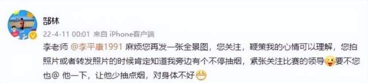 深圳队的老国脚并不多,而且这张照片的背影非常清晰,所以球迷们很快将这名球员锁定为郜林。今天凌晨,郜林在个人社交平台上发文写道,“李老师麻烦您再发一张全景图,您关注,鞭策我的心情可以理解,您拍照片或者转发照片的时候肯定知道我旁边有个不停抽烟,紧张关注比赛的领导,要不您也@他一下,让他少抽点烟,对身体不好。”