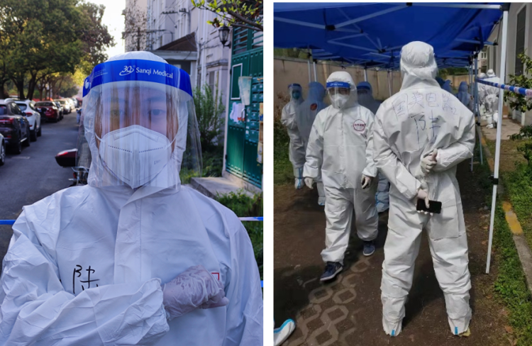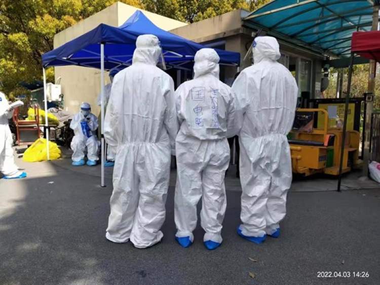 上海国美金桥旗舰店店长陆启曌担任其社区防疫小组长,组织12人,负责整个社区50多栋楼,700户人家,1500户居民。从上海决定在全市开展核酸检测起,他们凌晨4点就穿上防护服,因为防护服为密封式的,为了不造成防疫资源浪费,一整天他都没敢再喝一口水,再吃一口饭,没再脱下身上的防护服。