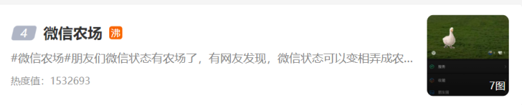 “微信农场”开业了,还一举登上了今天的热搜榜。周到君打开微信发现,不是想象中的那种QQ农场,也不是早期的那种能偷菜、抢车位的开心农场,原来就是“微信状态”中增加了奇奇怪怪、可可爱爱的动物表情(可不仅限于农场小动物),大家可以自由选择,还可设置背景图,形成奇妙的混搭,变相地弄成一个属于自己的微信小农场。