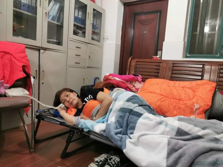 自4月1日浦西封控以来,项玉珍已经连续12天没回家,每日奋战达20小时,每晚屈就在居委会一张简易的行军床上。为提高居民咨询电话的接通率,她更把行军床挪到热线电话旁,24小时待岗,针对居民们的各种诉求,总是想尽办法帮助解决。有天凌晨1点多项玉珍刚躺下,就接到居民的求助电话,待解决完回到居委已是3点多,体力透支的她还未躺下眯一会,又接到物业电话说有位居民从金山逃回来拿药,需要她前去处理,等到6点新一轮核酸检测的“冲锋声”又响起,这一晚,项玉珍一夜未眠。事实上,很多个晚上她都睡不好一个完整的觉。